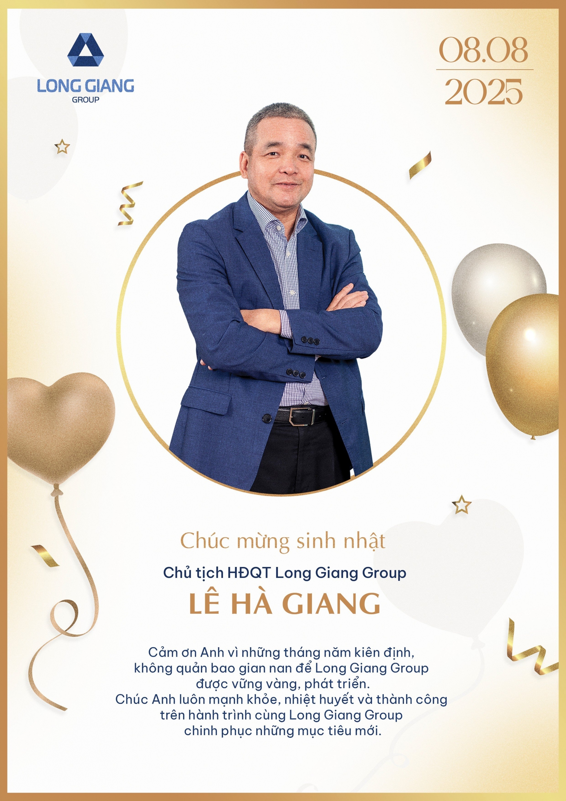 Hôm nay - ngày 8/8/2025, đại gia đình Long Giang Group xin gửi lời chúc mừng sinh nhật đến Chủ tịch HĐQT Lê Hà Giang – người lãnh đạo bản lĩnh, trí tuệ và đầy tâm huyết, đã luôn kiên định dẫn dắt con thuyền Long Giang vững vàng vượt qua bao thử thách, hướng tới giá trị nhân văn bền vững.